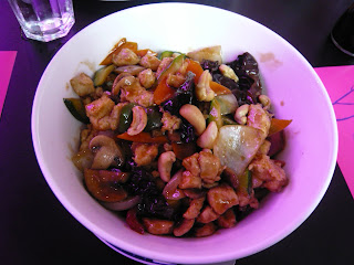 1つは”Huhn mit Cashewnüssenn”で7.9ユーロ。ご飯の上に鶏肉、カシューナッツ、きくらげ、野菜の炒め物(少しあんかけ)がかけてあります。中華丼みたいな感じです。かなりのボリュームで、テーブルに運ばれてきた時びっくりしました!女性は1人で食べるのは厳しいかも・・・熱々で野菜たっぷりでちょっぴり甘く、くせのない味でとてもおいしかったです(●´∀`●)メニューの材料を見て頼んだのでちょっとだけ不安がありましたが、私的にはかなり当たり♪でした。
