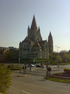 家に戻る途中,道を間違えて少し下流まで行ってしまいました.そのときに見つけた大きな建物です.ウィーン市内にある有名な教会と比べると,ちゃちく見えるのですが,すごく大きく見えました.
