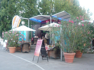 行ったところはU4"Rossauerände"駅の前のカフェです。ドナウ川沿いには期間限定でカフェがいくつか出来ています。その中の一つにとりあえずいってみました。私達が行ったのが、20:00過ぎで気がついたらお店のTVでもうすでに選手が入場しているのが見えました。